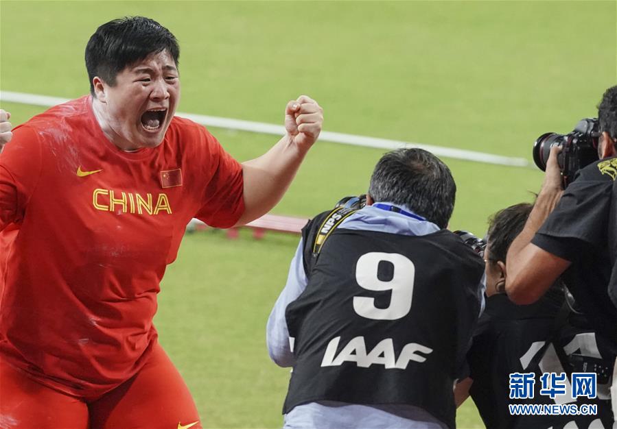 当日,在卡塔尔多哈举行的2019国际田联世界田径锦标赛女子铅球决赛中,卫冕冠军、中国选手巩立姣以19米55的成绩夺得冠军。 新华社记者王婧嫱摄