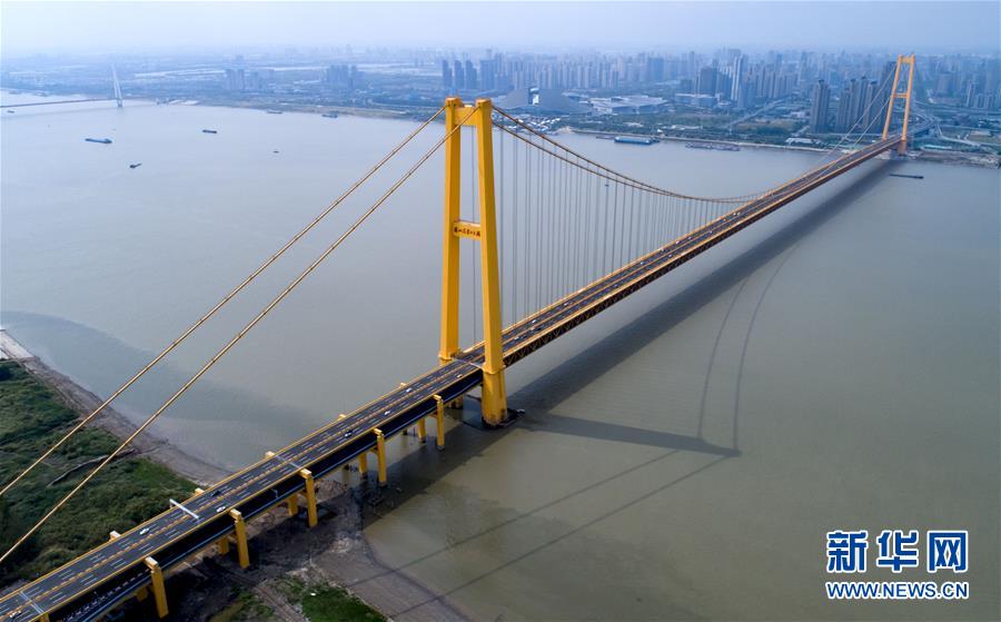10月8日,武汉杨泗港长江大桥正式通车(无人机拍摄)。当日,长江上首座双层公路大桥——武汉杨泗港长江大桥正式投入使用。杨泗港长江大桥全长4.13公里,主跨1700米,一跨过长江。大桥上层为城市快速路,双向6车道,设计行车时速80公里;下层为城市主干道,双向6车道,设计行车时速60公里。新华社记者熊琦摄
