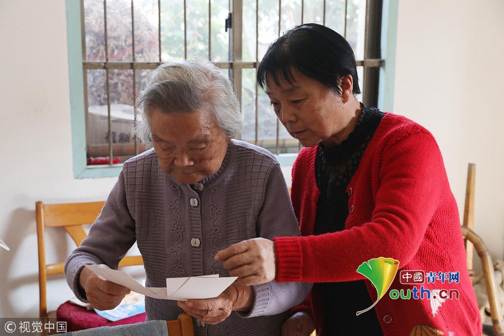 2018年10月31日,杭州,著名作家金庸的妹妹查良琇在浙江临安家中翻看照片。