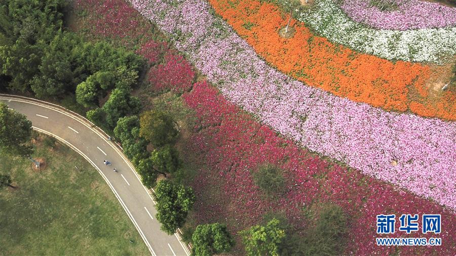 10月9日无人机拍摄的四季花海城市公园风景。 秋日时节,位于安徽省合肥市的四季花海城市公园花香四溢,色彩缤纷,成为游客和市民休闲游玩的好去处。 新华社记者 张端 摄