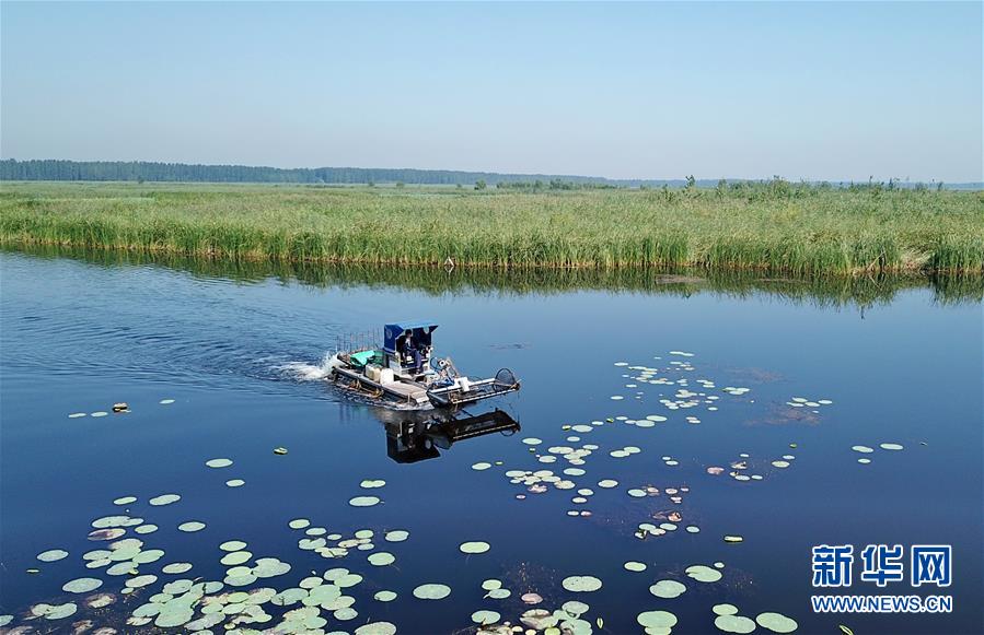 一艘打捞船在白洋淀景区内清理漂浮物(8月31日无人机拍摄)。新华社记者牟宇摄