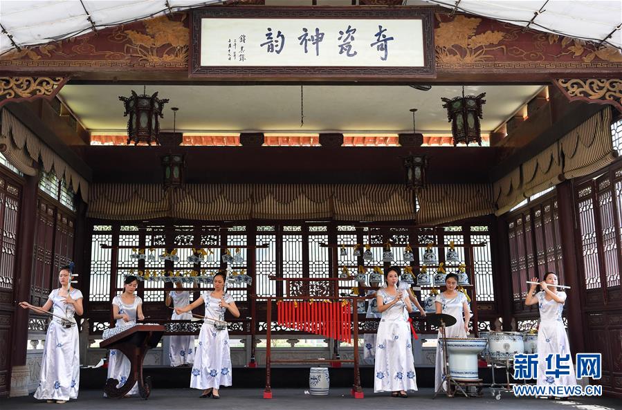 在江西景德镇古窑民俗博览区,演员们用瓷制乐器进行“瓷乐”表演(2018年9月20日摄)。新华社记者 万象 摄
