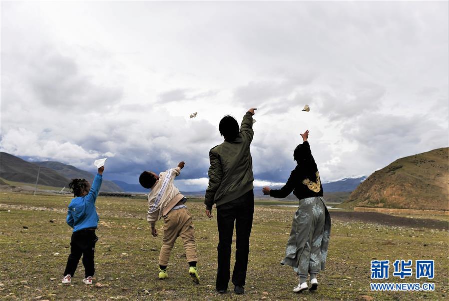 坚热益西(右二)在牧区和弟弟妹妹一起放飞纸飞机(7月13日摄)。新华社记者普布扎西摄