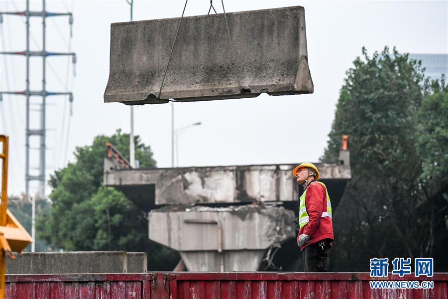 10月12日,锡港路恢复通车前,施工人员在进行路面清理工作。新华社记者 李博 摄