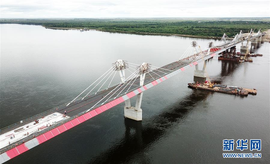 目前,中俄合建的首座跨境公路大桥——黑河到布拉戈维申斯克黑龙江(阿穆尔河)大桥进入桥面铺装施工作业阶段。大桥于今年5月31日顺利合龙,目前中方每天有约200名工人进行混凝土浇铸桥面作业,预计桥面施工将持续到9月上旬。大桥全长1284米,建成后将形成一条新的国际公路通道,实现中俄地方城市之间互联互通。