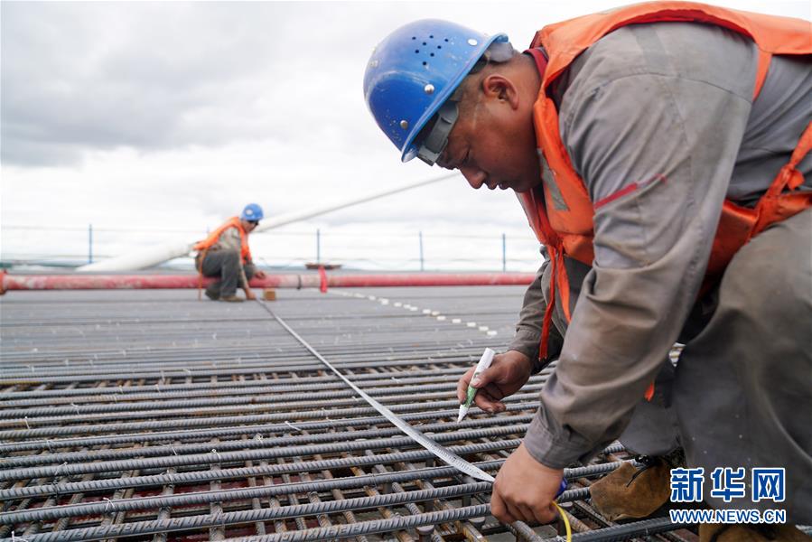 工人在大桥上进行桥面铺装施工作业(8月19日摄)。新华社记者王建威摄