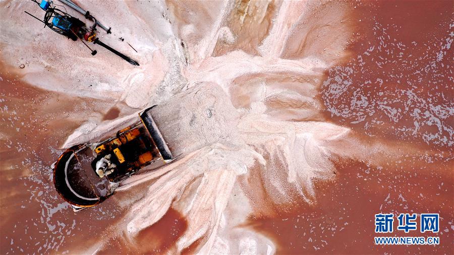鲁北盐场工人在盐池中收获海盐(10月9日无人机拍摄)。新华社记者 朱峥 摄