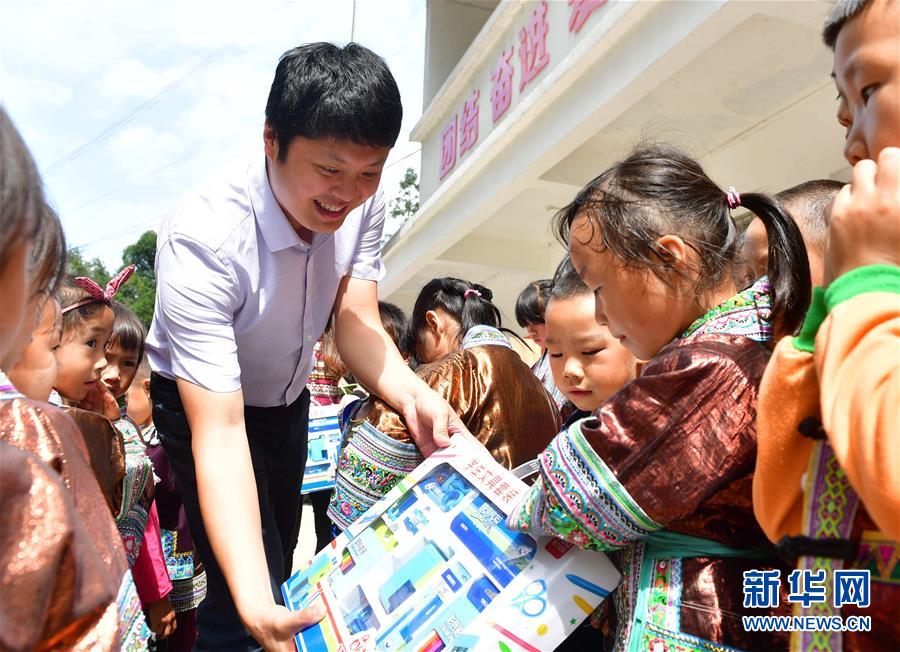 志愿者给黔桂乌英苗寨的孩子们发放文具(10月11日摄)。新华社记者 黄孝邦 摄