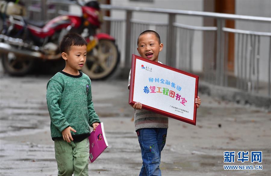 黔桂乌英苗寨的孩子捧着“希望工程图书室”的牌匾,准备悬挂(10月12日摄)。新华社记者 黄孝邦 摄