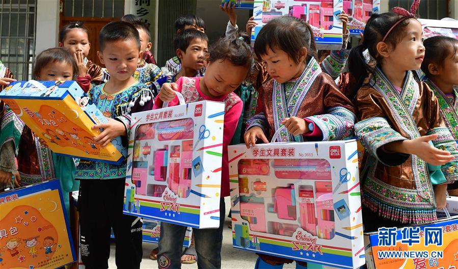 黔桂乌英苗寨的孩子们收到志愿者赠送的文具(10月11日摄)。新华社记者 黄孝邦 摄