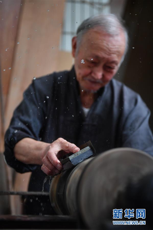 10月12日,丁国坤在家中对一件未成形的脱胎漆器进行“水磨”工序。新华社记者胡晨欢摄