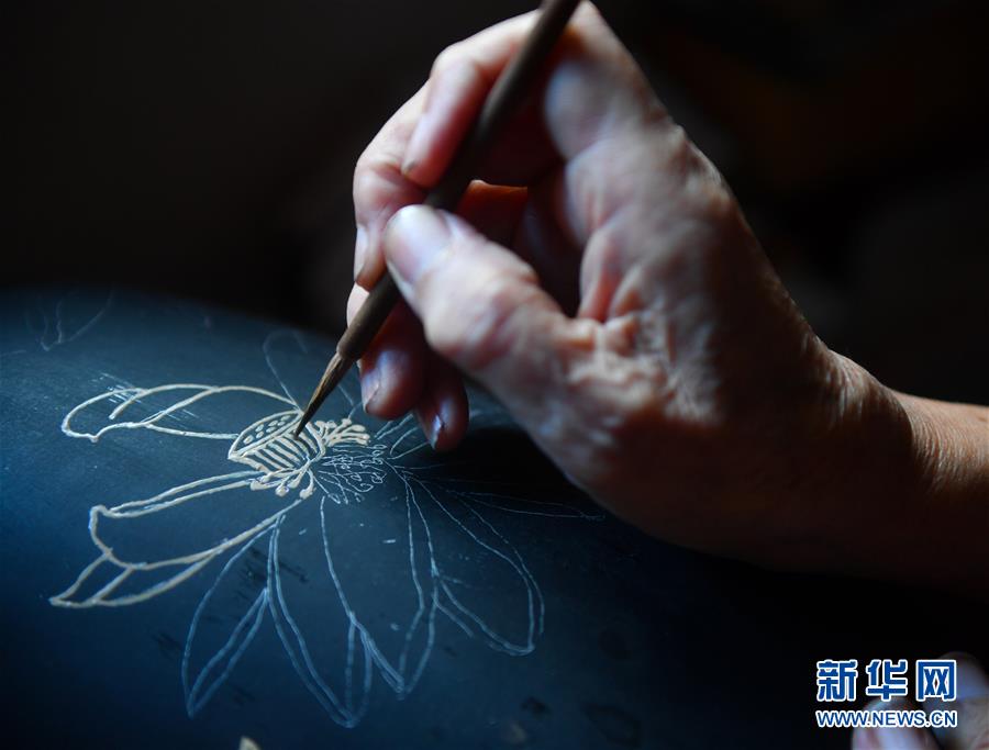 10月12日,丁国坤在家中对一件未成形的脱胎漆器进行“彩绘”工序。新华社记者胡晨欢摄