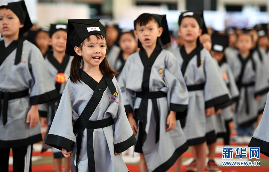 10月13日,参加仪式的小朋友在诵读《三字经》。当日,海口胡画少儿艺术中心为500名小朋友举行“开笔礼”,通过“点朱砂,启智慧”“习书法,描人字”等仪式让孩子们体验中国传统文化。新华社记者郭程摄