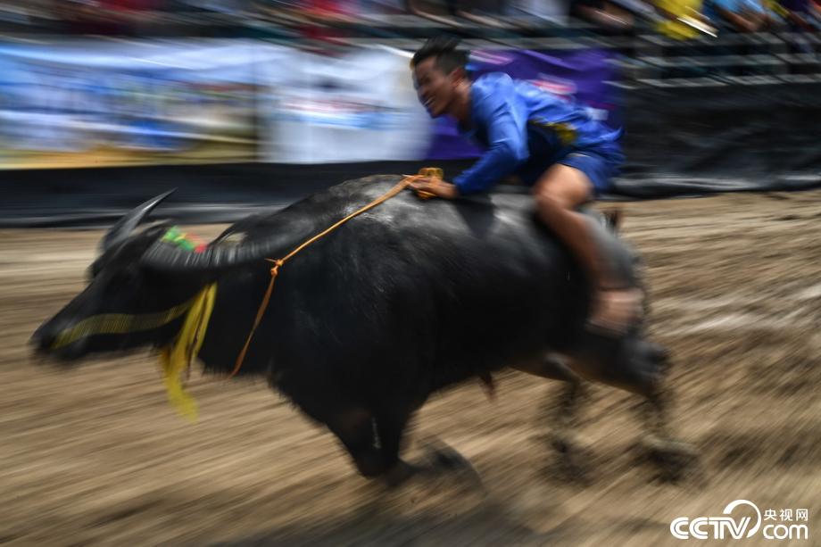当地时间2019年10月12日,泰国春武里举行一年一度的水牛赛跑,选手骑牛狂奔。视觉中国