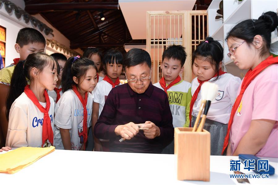 10月14日,小学生在非遗活态传承馆使用湖笔练习书法。 新华社记者 黄宗治 摄