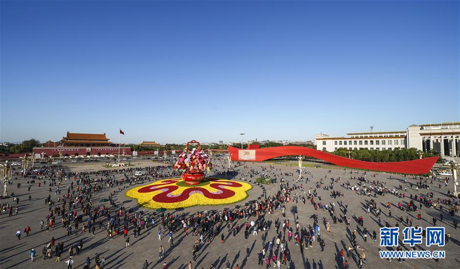 这是10月14日拍摄的天安门广场中心花坛。 10月14日,以“花果篮”为主造型的天安门广场中心花坛吸引了众多游客参观拍照。“花果篮”的夜景更是流光溢彩,绚烂迷人。 新华社记者 殷刚 摄