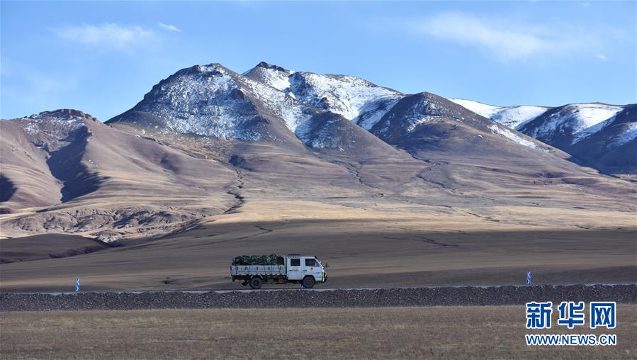 西藏那曲市申扎县境内,一辆卡车从山前驶过(10月12日摄)。 深秋时节的藏北,最低气温已降至零摄氏度以下,呈现出苍凉和壮美交织的独特景观。 新华社记者 周锦帅 摄