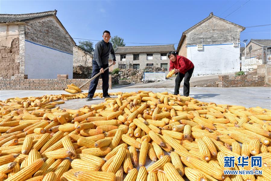 在夺火乡高谷堆村,村民在晾晒玉米(10月13日摄)。 新华社记者 曹阳 摄