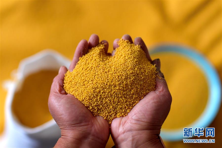 在夺火乡高谷堆村,村民展示收获的小米(10月14日摄)。 新华社记者 曹阳 摄