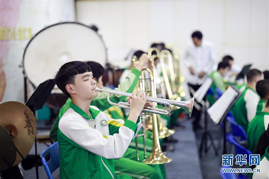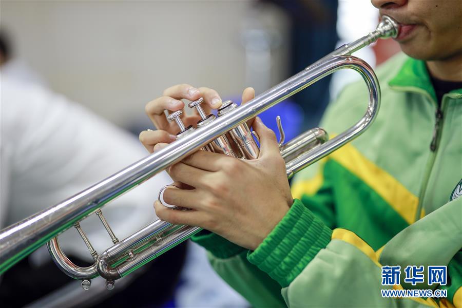 重庆市特殊教育中心排练厅,学生在排练开始前练习小号(10月9日摄)。 新华社记者 刘潺 摄