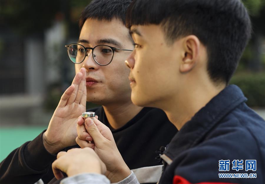 重庆市特殊教育中心的老师李沂念(左一)在教授盲童王太樊练习小号(10月10日摄)。 新华社记者 刘潺 摄