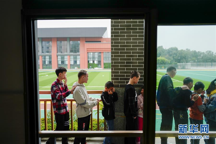 重庆市特殊教育中心的楼道里,王太樊(左一)和同学们相互搭着肩膀排队进入食堂吃午饭(10月10日摄)。 新华社记者 刘潺 摄
