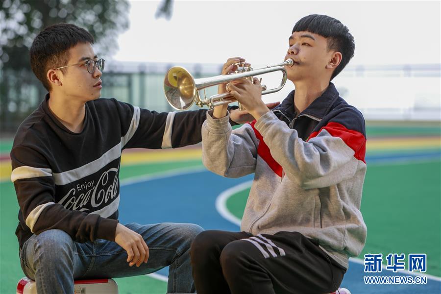 王太樊在教室外的楼道给自己心爱的小号试音(10月10日摄)。 新华社记者 刘潺 摄