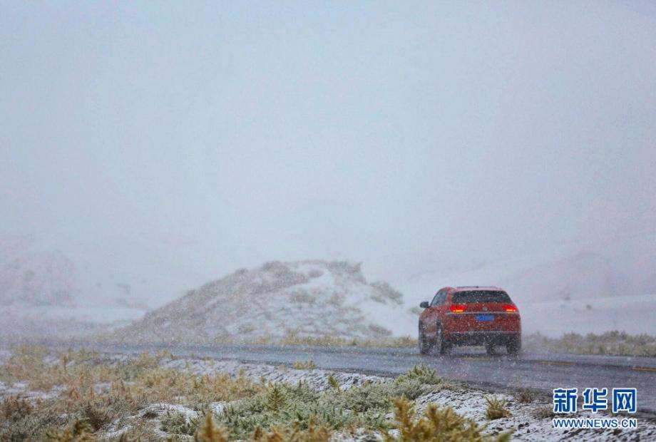 10月15日,在宁夏中卫市沙坡头景区,汽车在大雪中行进。新华网杜文杰摄