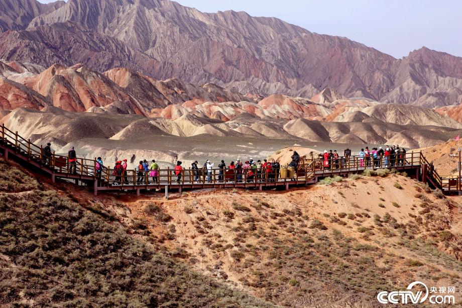 央视网消息:2019年10月15日,金秋时节,位于甘肃省张掖市临泽县的七彩丹霞景区进入旅游旺季,吸引众多游人纷至沓来。张掖七彩丹霞景区,分布面积约50公里,是中国北方干旱地区发育最典型的丹霞地貌。在方圆数十平方公里的范围内,随处可见有红、黄、橙、绿、白等多种鲜艳的色块或线条,把一座座山峰,一条条沟壑,装点成一幅幅绚丽多姿、灿烂夺目的画图。图片来源:视觉中国