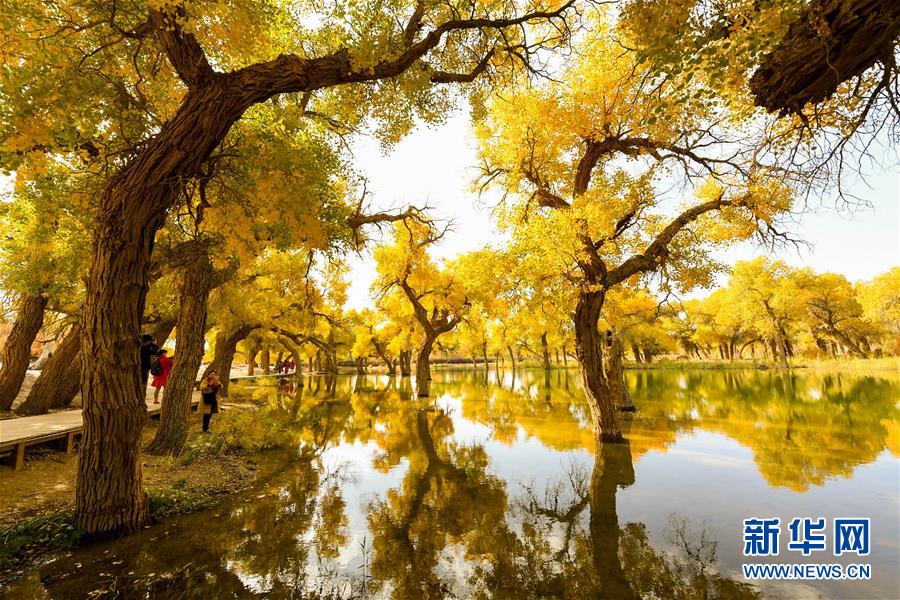 10月16日,这是内蒙古阿拉善盟额济纳旗境内的胡杨林。金秋时节,位于内蒙古阿拉善盟额济纳旗境内的胡杨林披上了金黄色的外衣,在阳光的照射下呈现绚丽夺目的色彩,成为沙漠深处的一抹亮色。新华社记者彭源摄