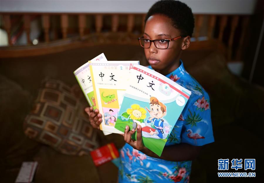 9月25日,在美国芝加哥,卡亚·恩朱比展示汉语课本。 新华社记者 汪平 摄