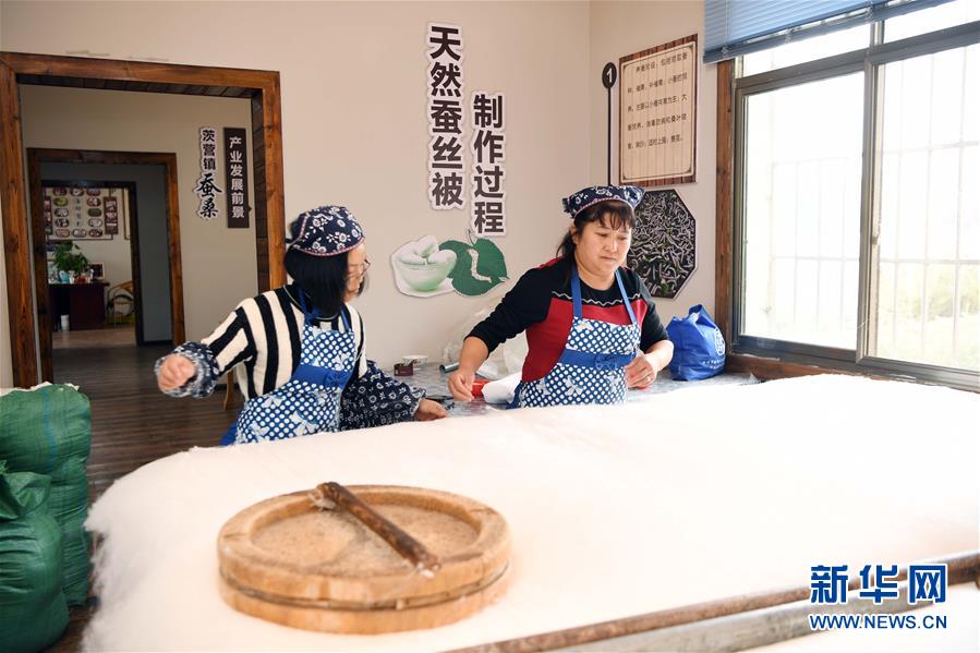 10月16日,团结村的“巧媳妇”龚粉珍(右)和张会敏在制作蚕丝被。 新华社记者 杨宗友 摄