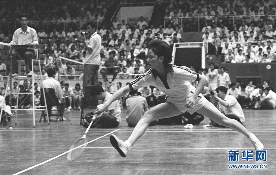 图为韩爱萍在杭州举行的第二届世界羽毛球锦标赛女子单打比赛中跨步救球(资料照片),她最终夺得女单冠军。新华社记者胡越摄
