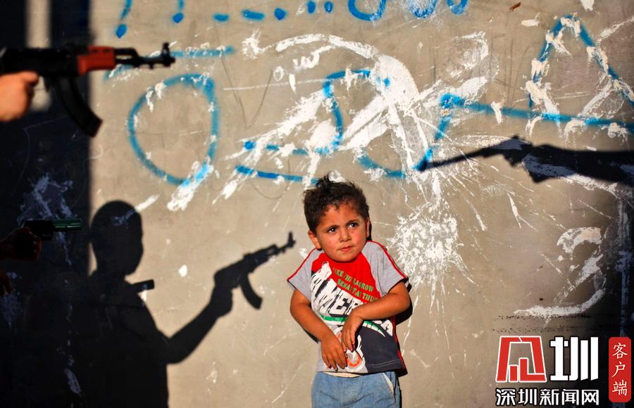 当地时间2009年6月16日,约旦河西岸拉马拉,Al-Amari难民营里,一个巴勒斯坦小男孩面对朝他举着玩具枪的少年露出惊恐的表情。