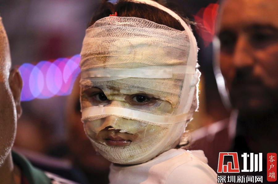 当地时间2016年7月9日,伊拉克卡拉达,4岁的Asal Ahmed在爆炸现场被爸爸抱着。开斋节期间,Asal和妈妈一起逛街,结果碰上一起自杀性炸弹袭击,两人都严重烧伤。