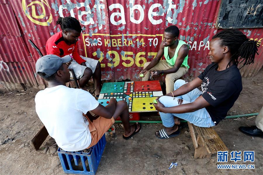 10月16日,在肯尼亚内罗毕基贝拉贫民窟,人们在街边玩桌游。新华社记者王腾摄