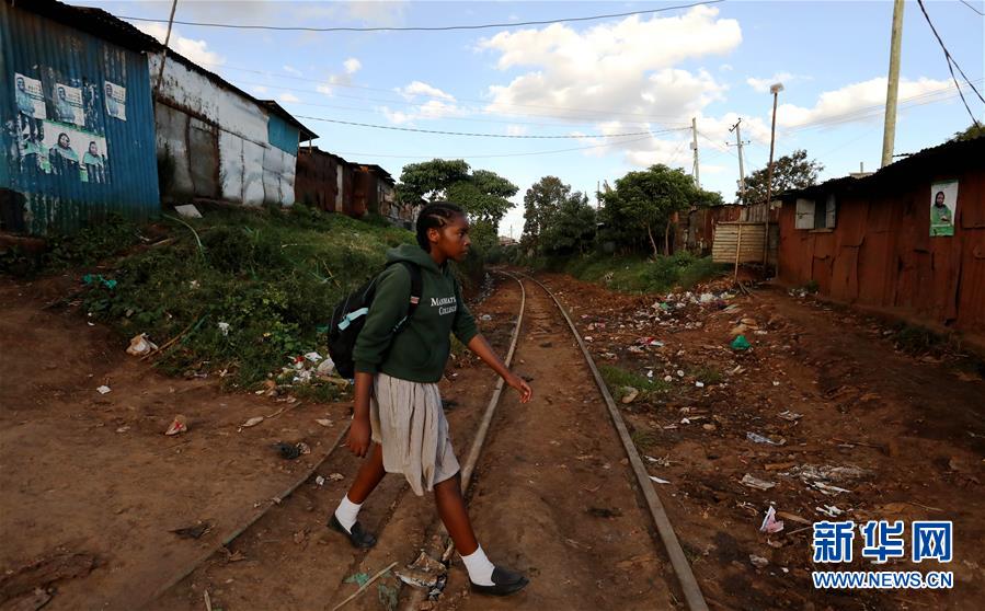 10月16日,在肯尼亚内罗毕基贝拉贫民窟,一名学生走过铁轨。新华社记者王腾摄