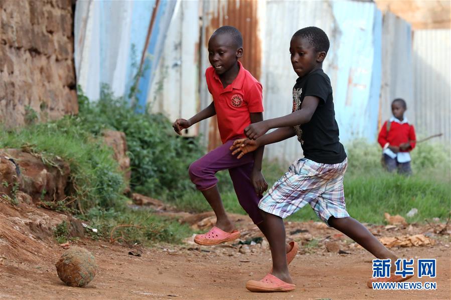 10月16日,在肯尼亚内罗毕基贝拉贫民窟,两名儿童在路边踢足球。新华社记者王腾摄