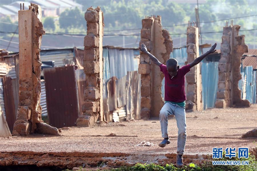 10月16日,在肯尼亚内罗毕基贝拉贫民窟,一名儿童在放学后玩耍。新华社记者王腾摄