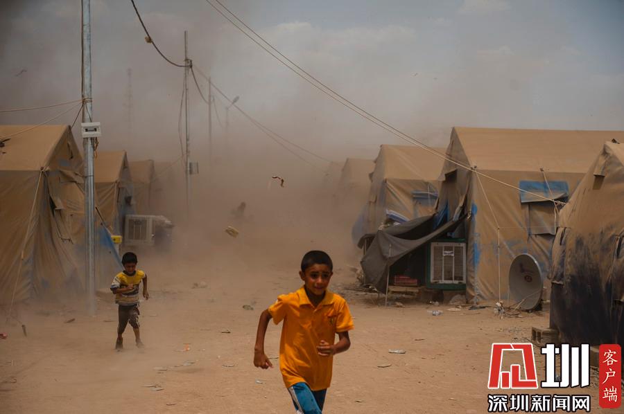 当地时间2014年7月23日,伊拉克Khazir,Khazir难民营的孩子们在沙尘暴中奔跑。逃离“伊拉克和黎凡特伊斯兰国”(ISIS)极端组织的伊拉克人在Khazir难民营里避难。这所难民营建于6月10日,目前有700人住在这里,其中大多数是穆斯林。