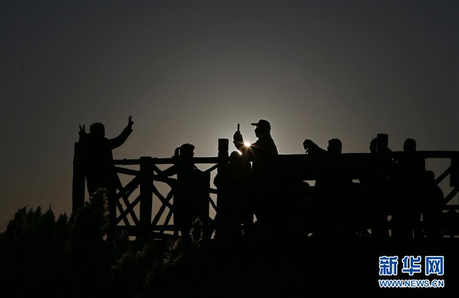 10月17日,游客在居延海岸边的木栈道上观赏水鸟。新华社记者 彭源 摄