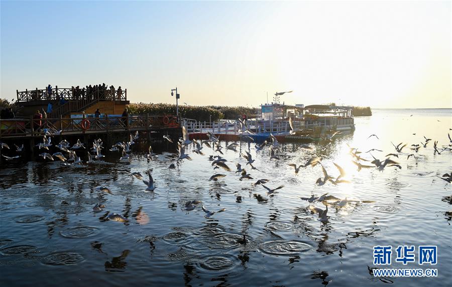 10月17日,游客在居延海岸边的木栈道上给水鸟喂食。 新华社记者 彭源 摄