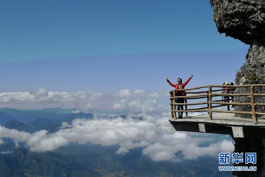 10月17日,游客在汉中市南郑区龙头山风景区拍照。  陕西省汉中市南郑区龙头山风景区位于川陕交界处米仓山主梁。龙头山景区常年云雾缭绕,宛如仙境,还有奇石、云海、彩林、雾凇等景观令游客流连忘返。 新华社记者 张博文 摄