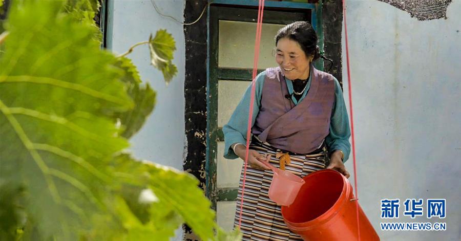 赞堂社区居民扎桑在给自家的植物浇水(9月16日摄)。 新华社记者 洛卓嘉措 摄