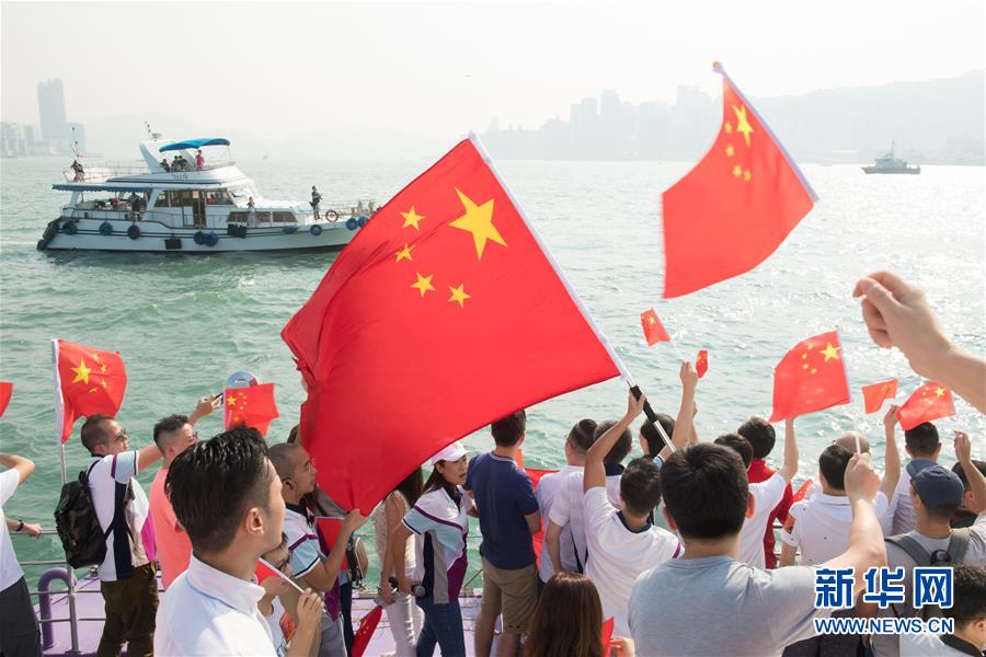 10月1日,香港市民在维多利亚港参加巡游。当日,约300名香港市民以游船方式庆祝新中国成立70周年。 新华社记者翁忻旸摄