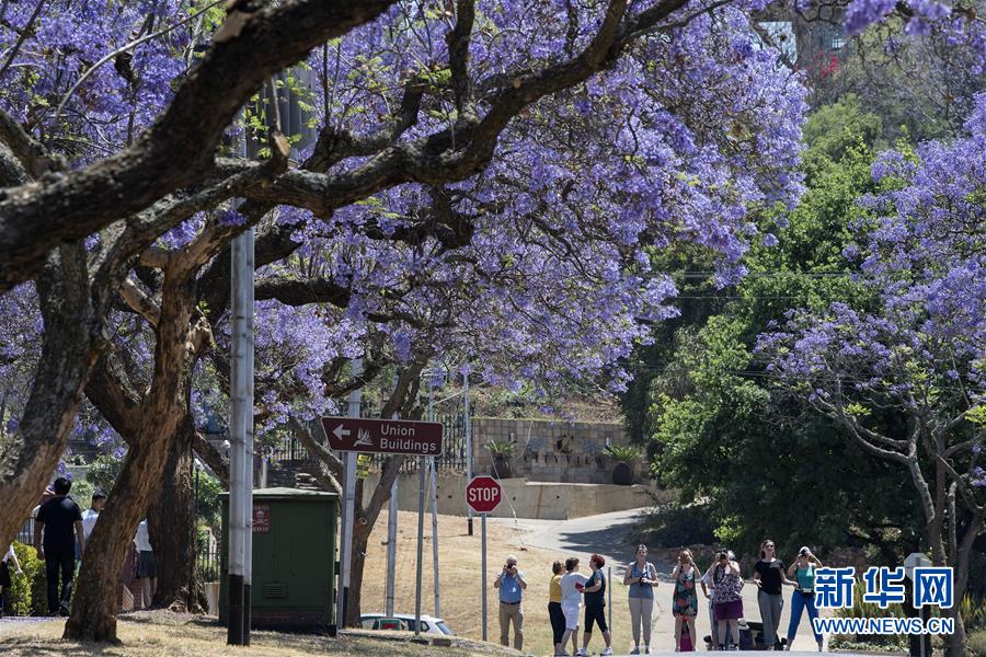 10月20日,在南非比勒陀利亚,游人在蓝花楹树下赏花。新华社记者陈诚摄