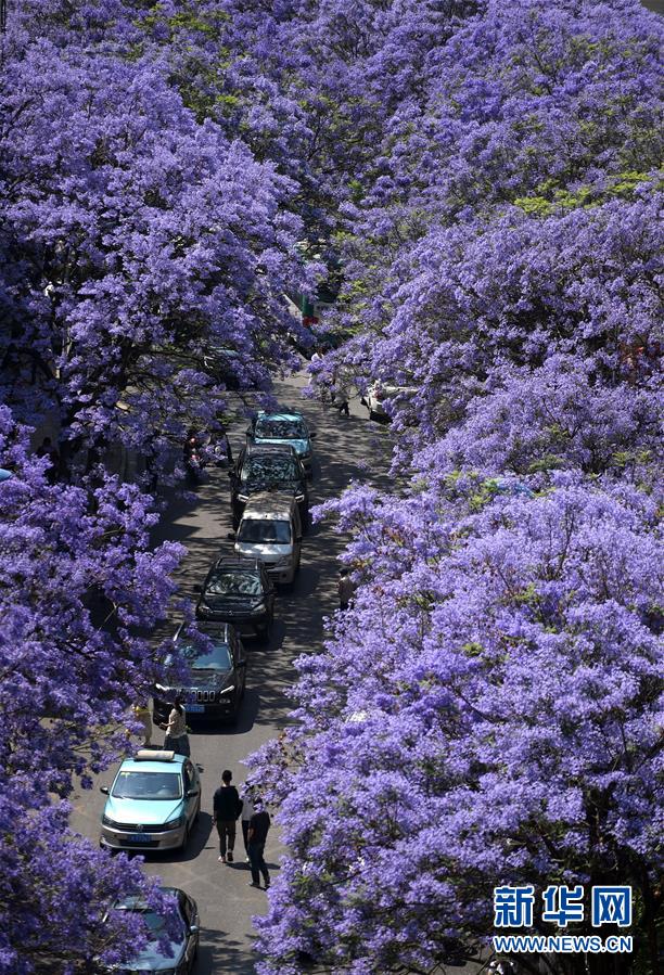 昆明市教场中路一带的蓝花楹进入盛花期(4月24日摄)。新华社记者秦晴摄
