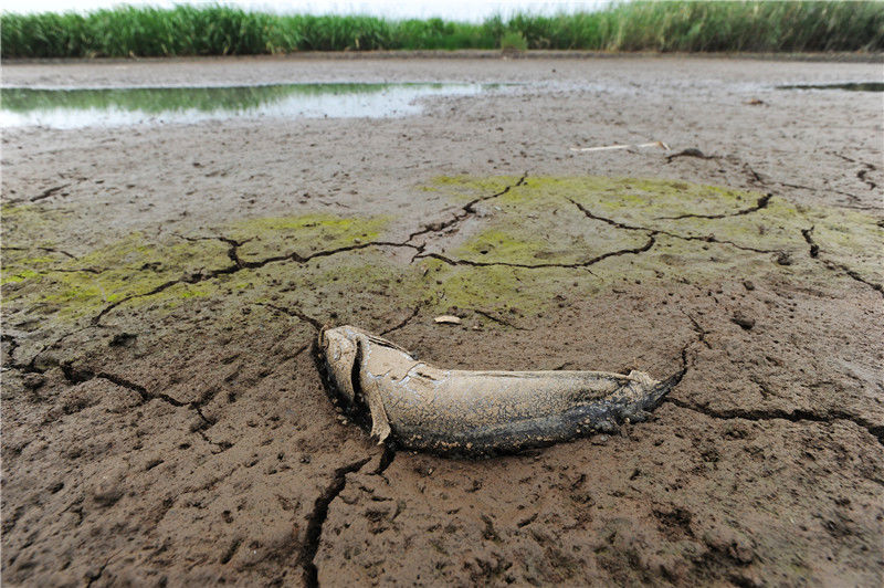 2011年9月21日,江西鄱阳湖,一条没来及逃离的鱼干死在河床上。