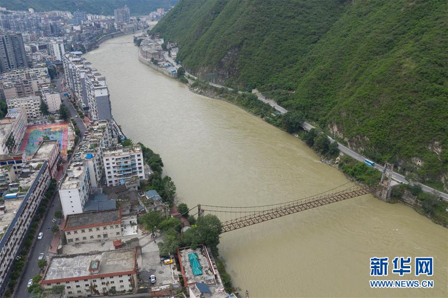 这是大渡河的钢索汽车吊桥(6月27日无人机拍摄)。 新华社记者 江宏景 摄