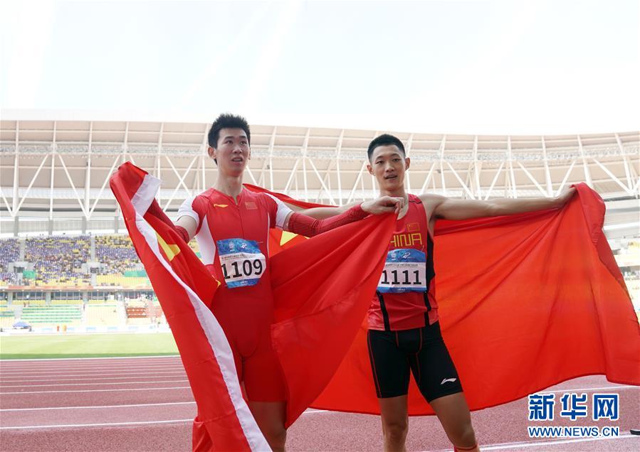 10月24日,中国选手王嘉男(右)、黄常洲在比赛后庆祝。 新华社记者金良快摄